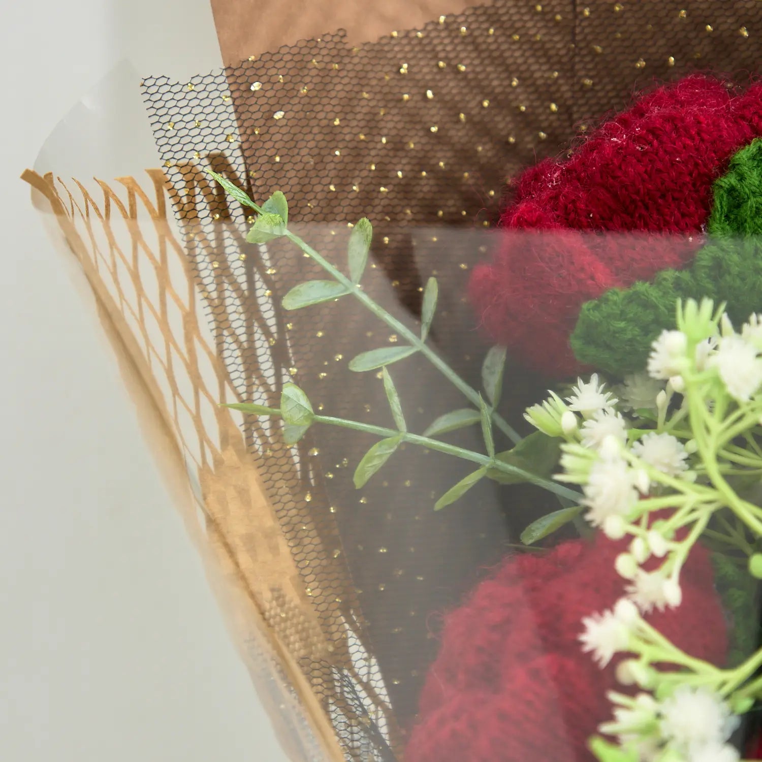 All crochet flowers in this bouquet are carefully 100% handmade. Each petal takes 20 minutes to create and each flower takes 2 hours to make. To complete a full bouquet, we spend nearly a whole day. That's because every bouquet is the result of 28,800 individual crochet stitches.